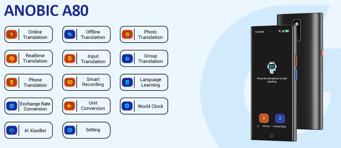 Anobic A80 je překladač, který integruje různé formy překladu, jako je mobilní překlad, překlad z fotografií, online překlad, offline překlad a textový překlad. Využívá hlasovou technologii iFlytek s rychlostí překladu 0,5 sekundy a přesností až 99 %. Nabízí překlad do 139 online jazyků, včetně japonštiny, korejštiny, němčiny, francouzštiny a arabštiny. Je vybaven inteligentním AI modelem ChatGPT, díky kterému je ideální pro chytré cestování a kancelářské využití.